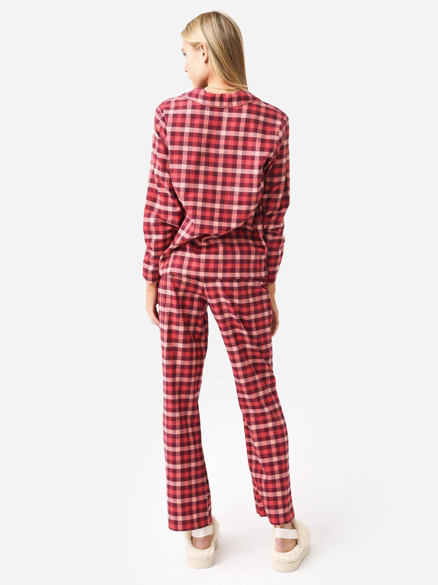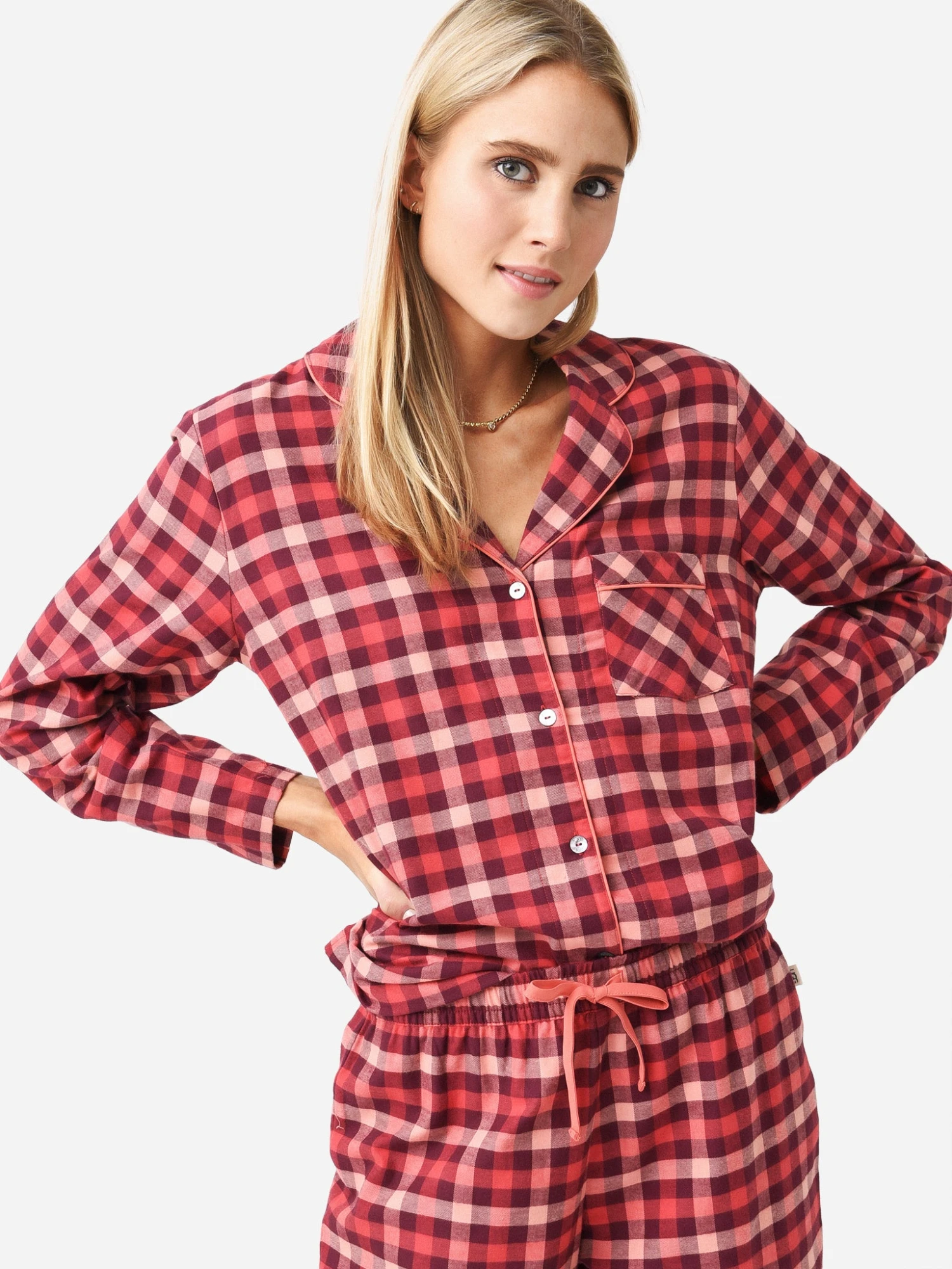 Plaid cotton pajama set with satin piping.